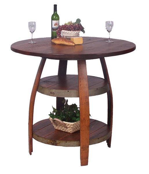 One of our best - features 4 larger wine barrel staves, a larger 40" rough sawn wood top with 2 storage/display shelves. Perfect bistro height that will easliy accommodate 4 24" 818 stools.