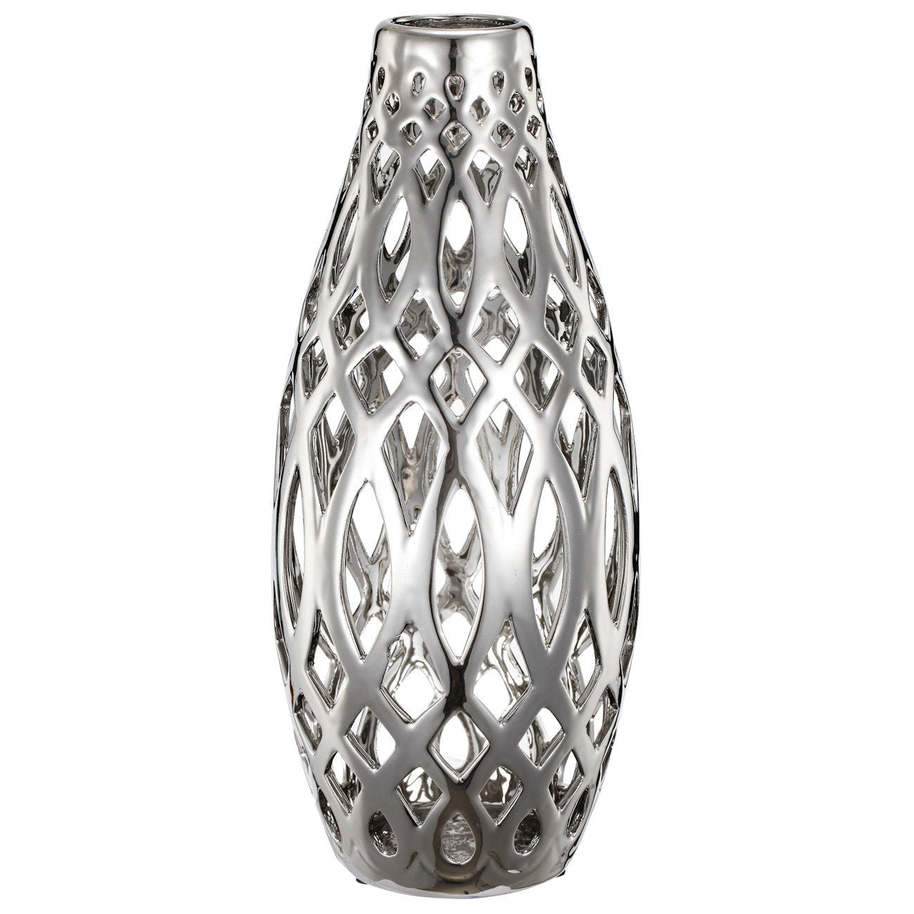 This Ceramic Cutwork Vase, designed by Anthony Venetucci, has a ceramic construction. It has a lovely silver color with a metallic finish. The metallic tone gives it a rich appeal and makes it appear like a priceless treasure. It is a wonderful decorative piece for any style of room in your home. Made of ceramic.