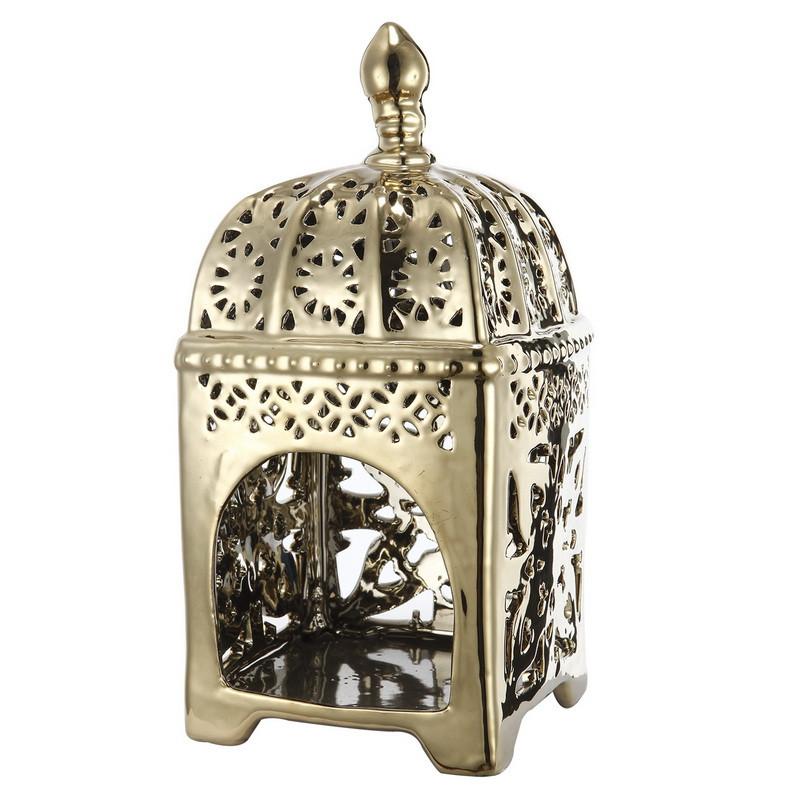 Ceramic lantern in dramatic metallic gold with handle and cut out detail. This piece will be a great addition to your home over the festive period and beyond.