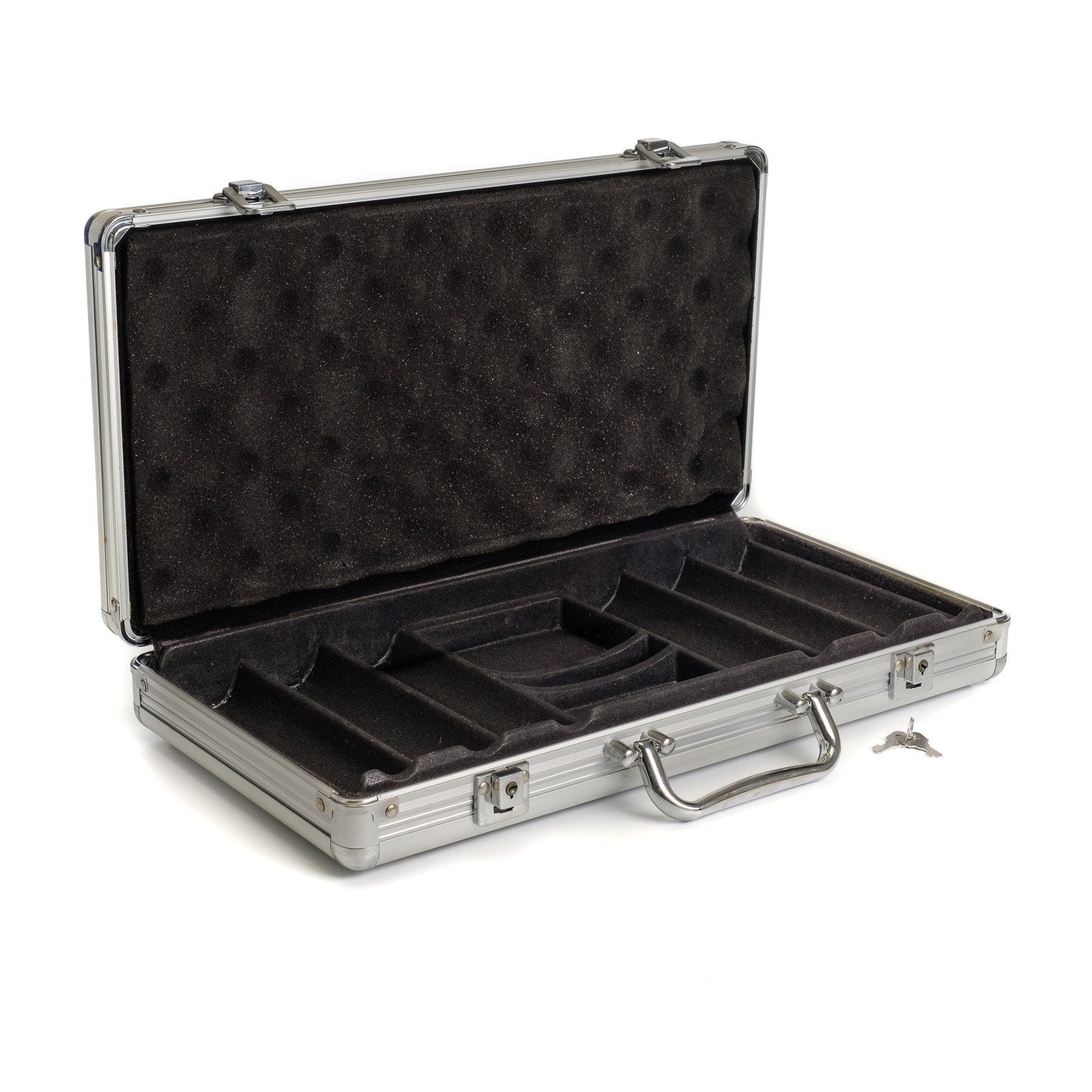 Here is our great deal on a deluxe locking executive-style 300 Chip Aluminum Poker Case. This heavy duty, lightweight aluminum poker case has been redesigned with ribbed surfaces and rounded corners for a stronger reinforced frame structure. This stylish aluminum briefcase design contains 6 slots with dividers holding 50 chips each and storage for two decks of cards and 5 dice. The textured black interior of the case is outfitted with handsome chromed latches, hinges and a handle which is securely fastened for years of use. Don't be fooled by lower quality cases. We have taken great care to ensure this case has the upgraded strength where required.