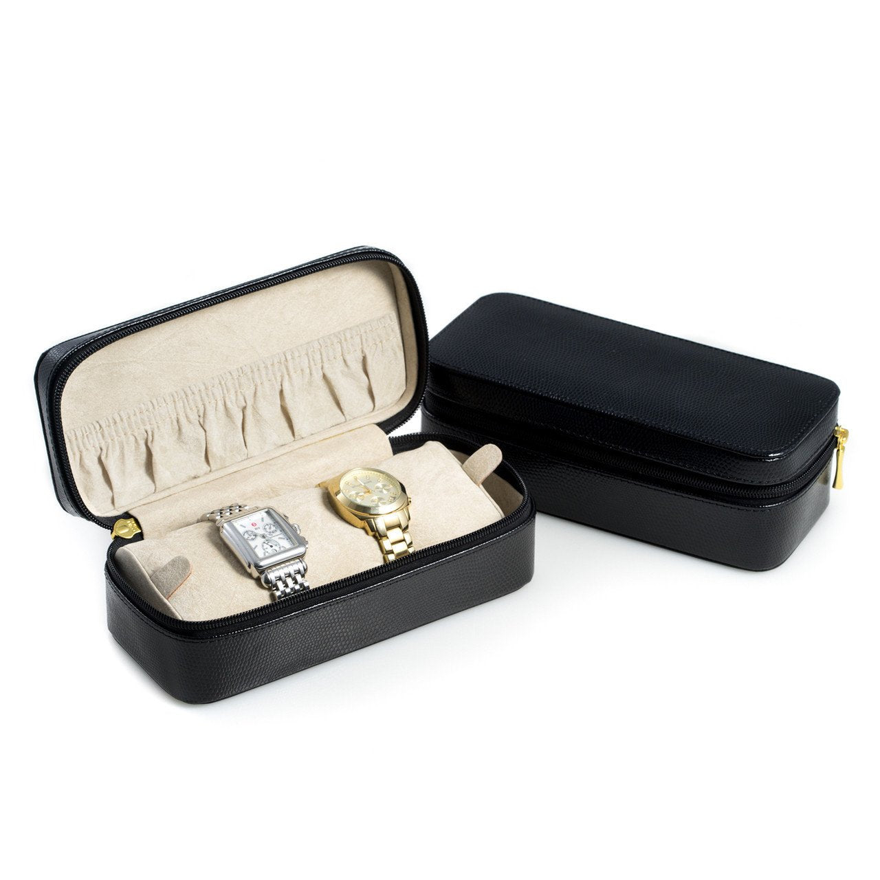 Black "Lizard" Leather Watch and Bracelet Case with Soft Velour Lining and Zipper Closure.