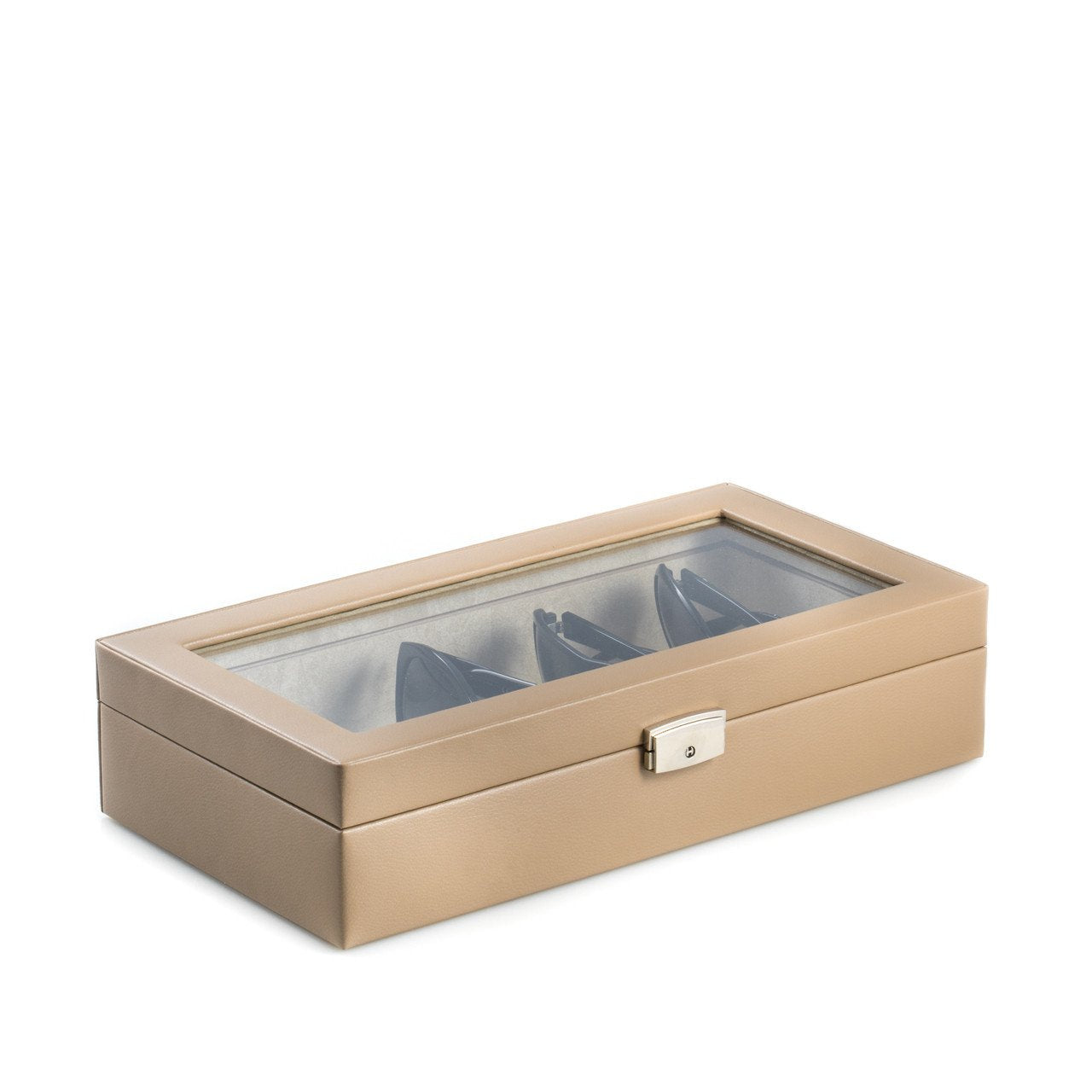 Taupe Leather Multi Eyeglass Case with Glass Top, Velour Lining, and Locking Clasp.