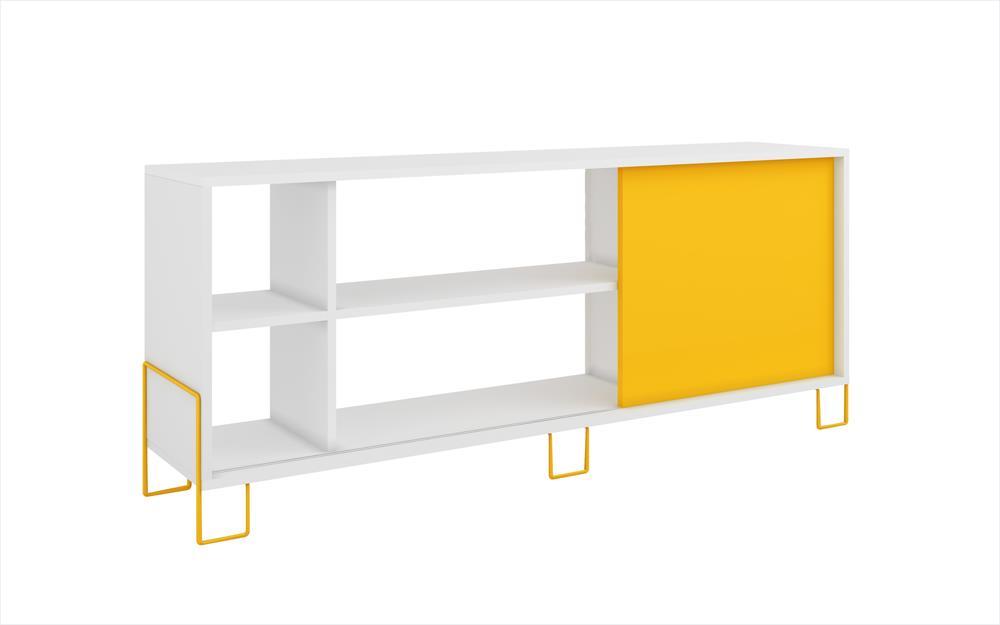 Need to spice your living room? The Motala TV Stand is perfect to liven up your living room area. Made of high quality MDP with beautiful color options. ! Its unique base design will add taste and details to your living room and theater experience. The stand includes 5 open shelves, and 1 sliding door giving it a perfect unique look. Keep your media accessories organized and display any items you want!