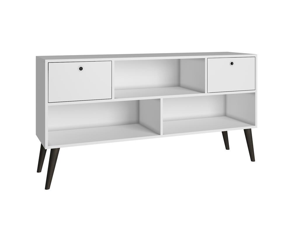 Let your home be more beautiful with The Uppsala TV Stand. Uppsala is part of a retro style collection designed to create and energetic atmosphere. Made of high quality MDP with colorful finishes. Its unique design includes splayed legs and ring drawer holes. With 3 shelves and 2 drawers there is space to store and display media items, books, pictures and more!