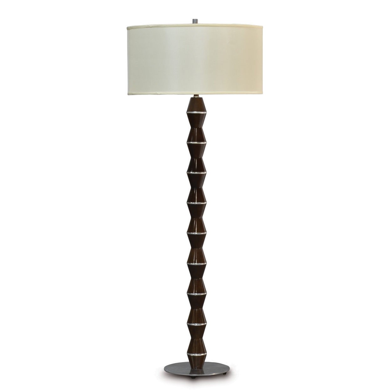 Hand-carved plantation hardwood stem in walnut finish with silver leaf trim. Aluminum round base and feet. Ivory silk round drum shade. 150 W max. 3-way turn key switch at socket. 7' average length of cord from lamp base to socket. The specified bulbs are not included. Any bulbs that may be included are only for California compliance. Some color variation in photos of our products, including furniture finishes, leathers and fabrics, is possible due to lighting and differing resolution quality on computer devices.