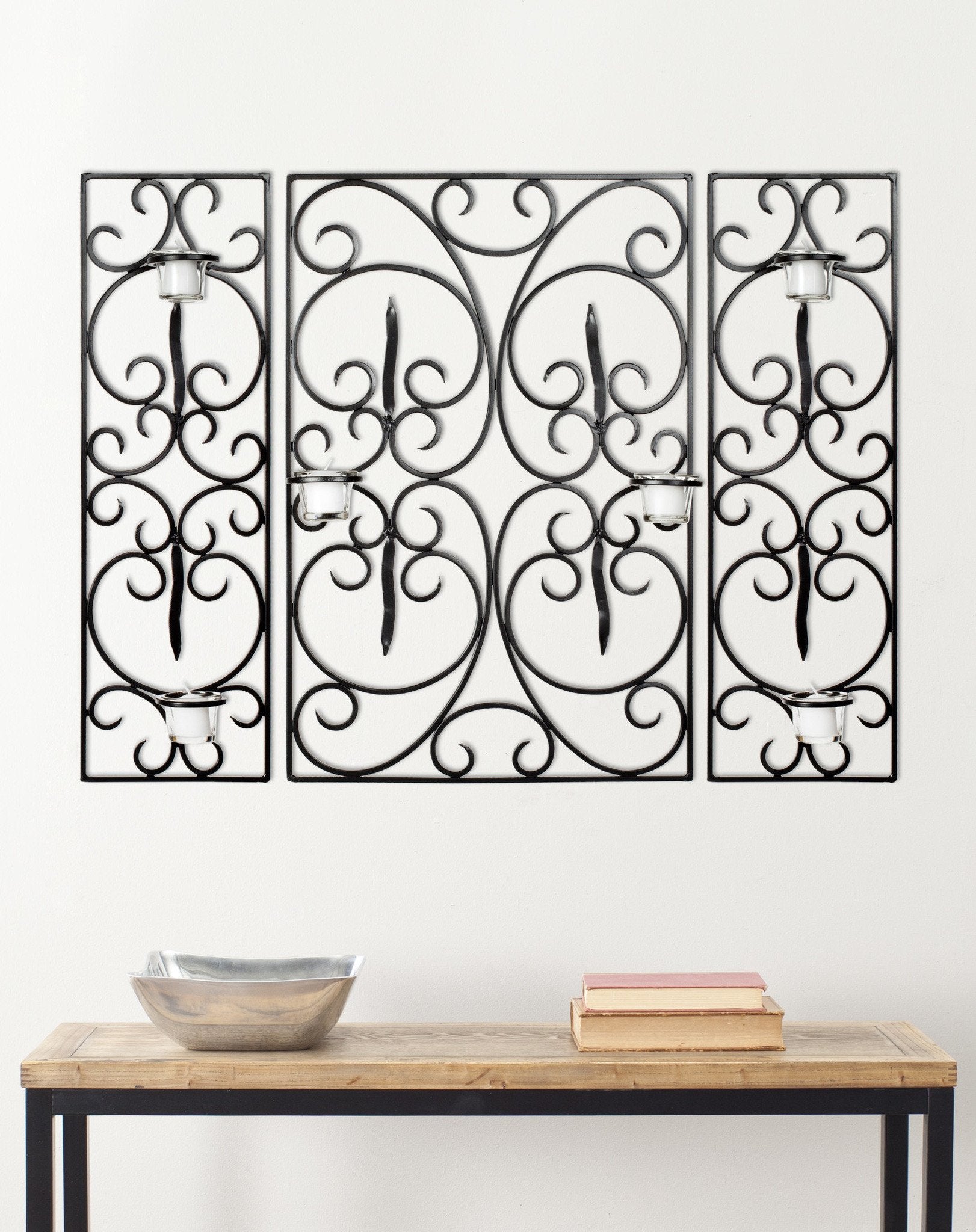 Three rectangular panels, with six glass votive candles holders, make a dramatic statement. This classic scrollwork patterned wall sconce is crafted from iron, with a sophisticated black finish.