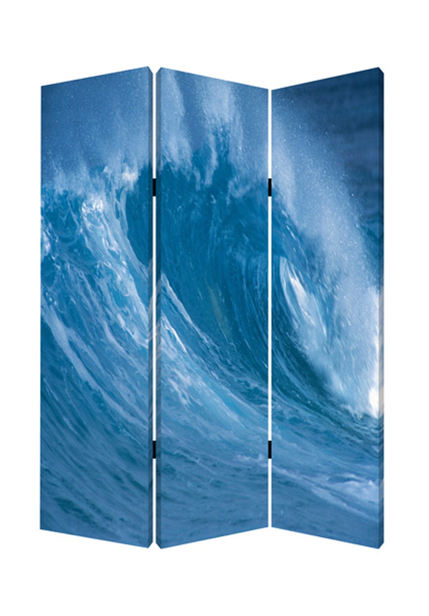 This is a 3 panel screen printed on canvas. The screen is two sided with different and complementary images on each side. It is light weight and very easy to move. The screen also has inspirational wall décor applications.