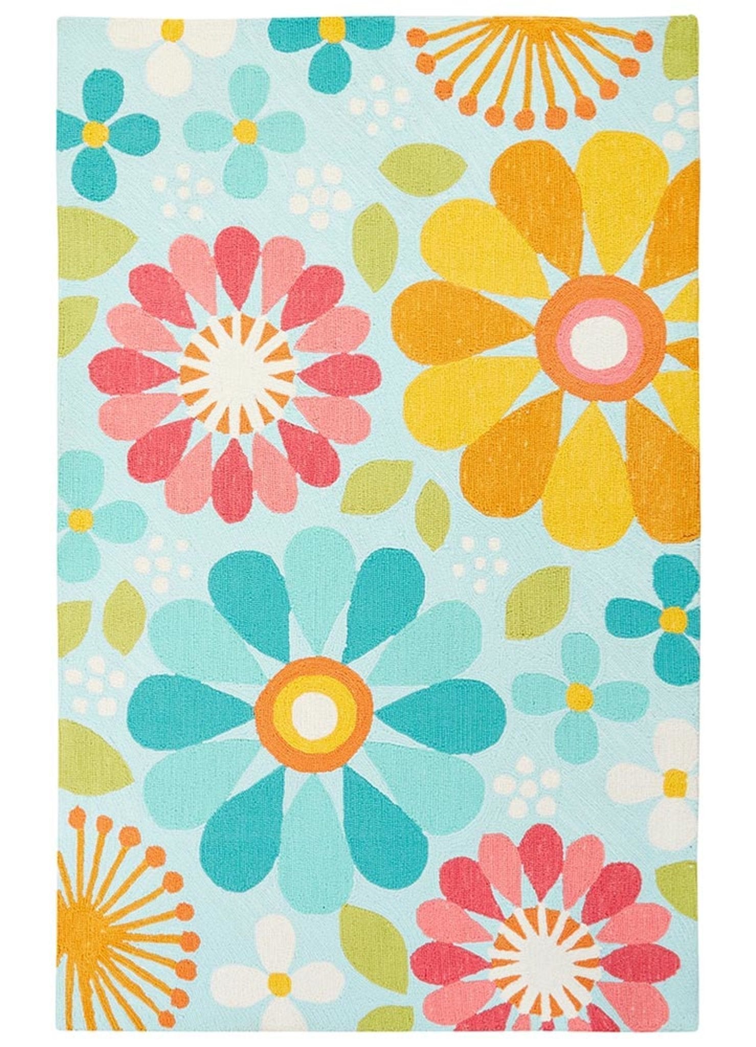 Welcome sunbeams into nurseries, kids rooms, and playrooms. A springtime bouquet dances across a gentle sky blue background; in hand-tufted poly, with a warm, floral color palette.