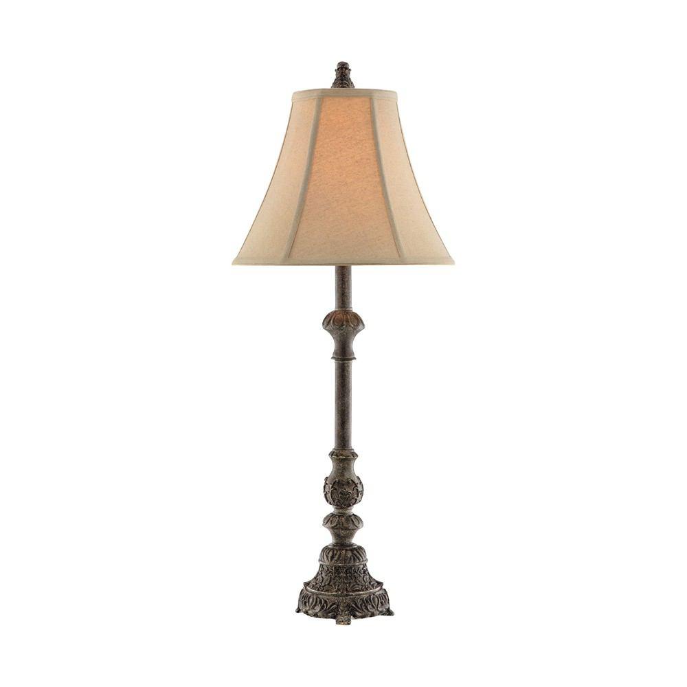 Intricate flower design base resin buffet lamp. Antique dark brown finish with ivory Empire softback shade.