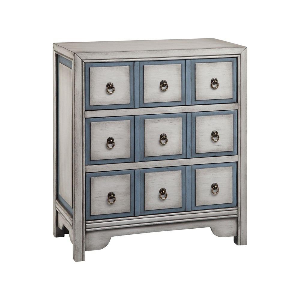 Three-drawer apothecary style chest. Hand-painted smokey white and slate blue finish. Bronze finish drop-ring pull hardware.