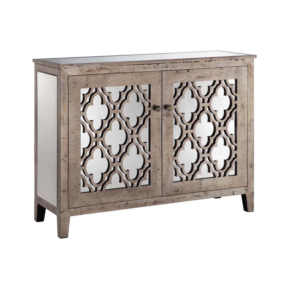 Two-door mirrored accent cabinet with one adjustable shelf. Hand-painted antique champagne finish. Quatrefoil pattern fretwork on mirror door fronts. Beveled mirrored top and sides.