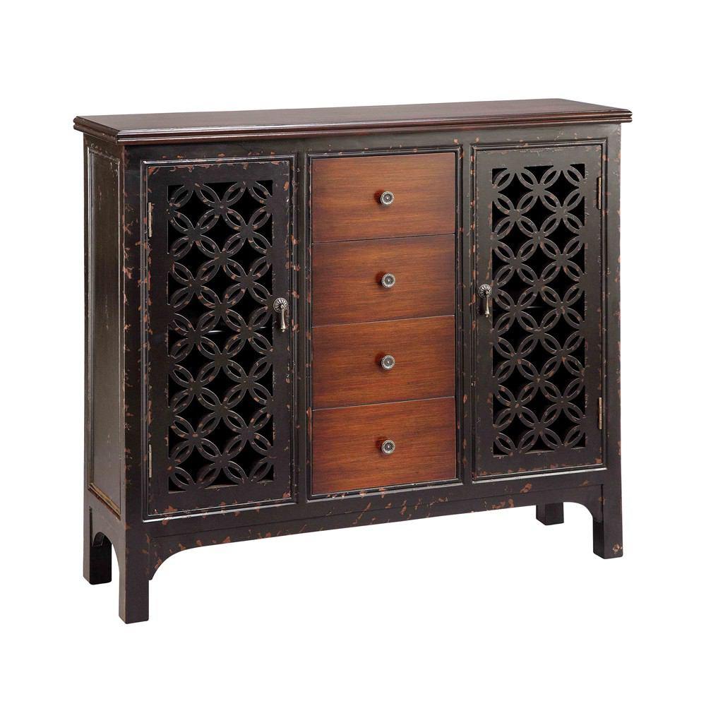 This beautiful cabinet, crafted from birch veneers with a dark cherry finish features two doors and four middle drawers to add storage to any room in your home.