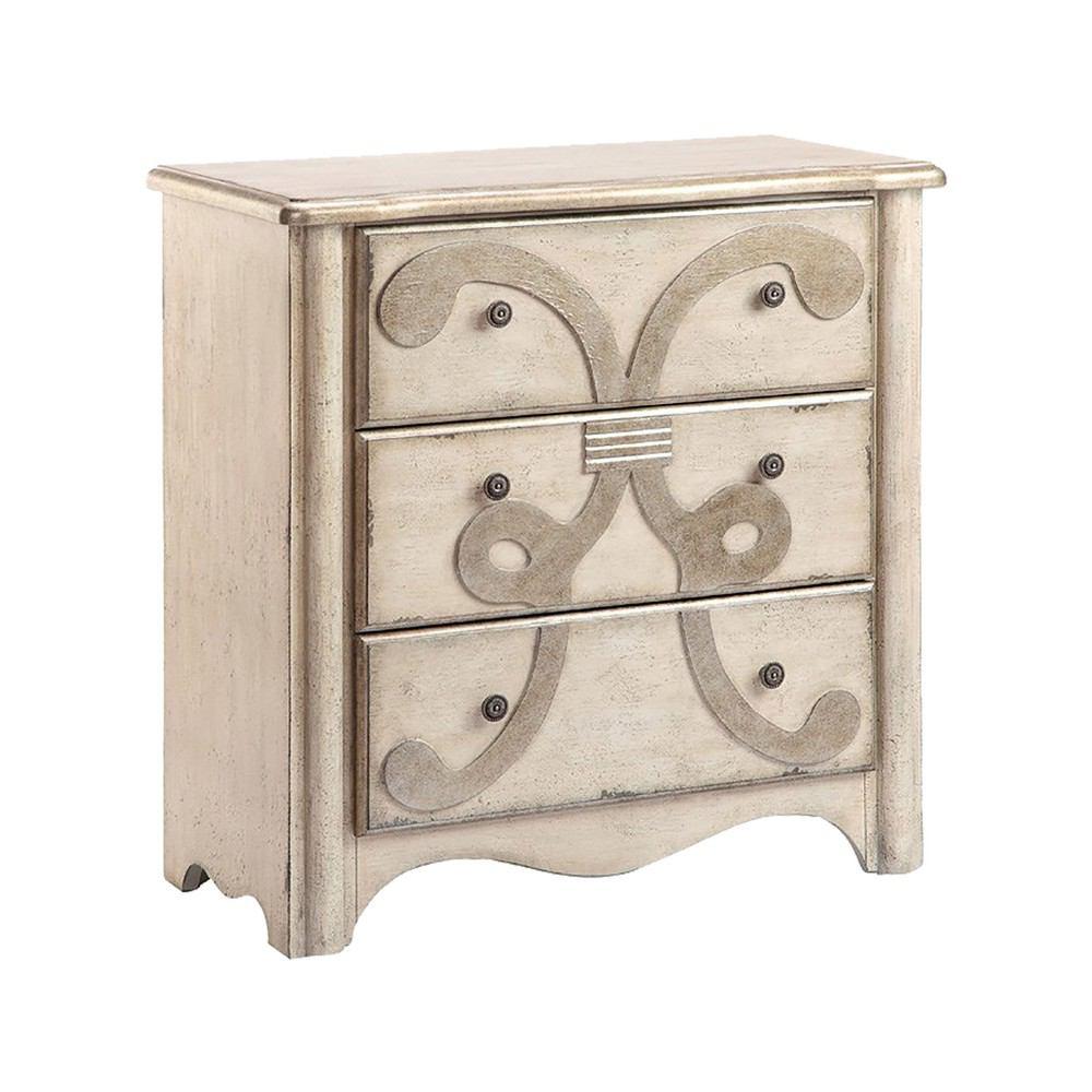 Three-drawer accent chest . Hand painted oatmeal finish. Champagne raised scroll design with scalloped lower apron.