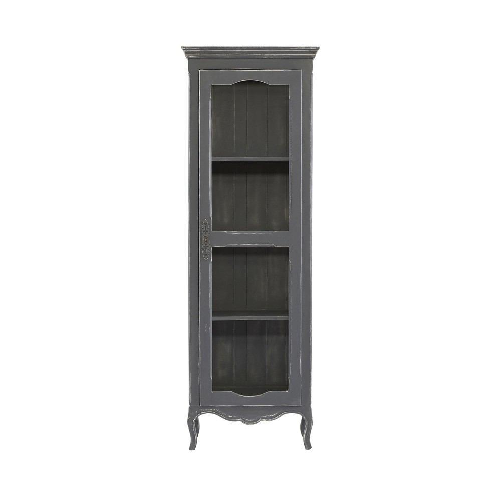 Tall-slender curio cabinet with three removable shelves . Hand-painted sapphire gray antique finish with white rub through. Glass front door panels with key pull hardware. Delicate curved apron and legs.