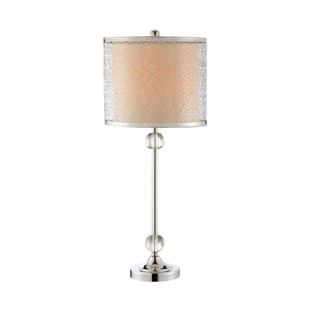 Chrome finish metal table lamp with two crystal sphere fonts. Double drum shade: outside shade intricate metal design inside white hardback shade.