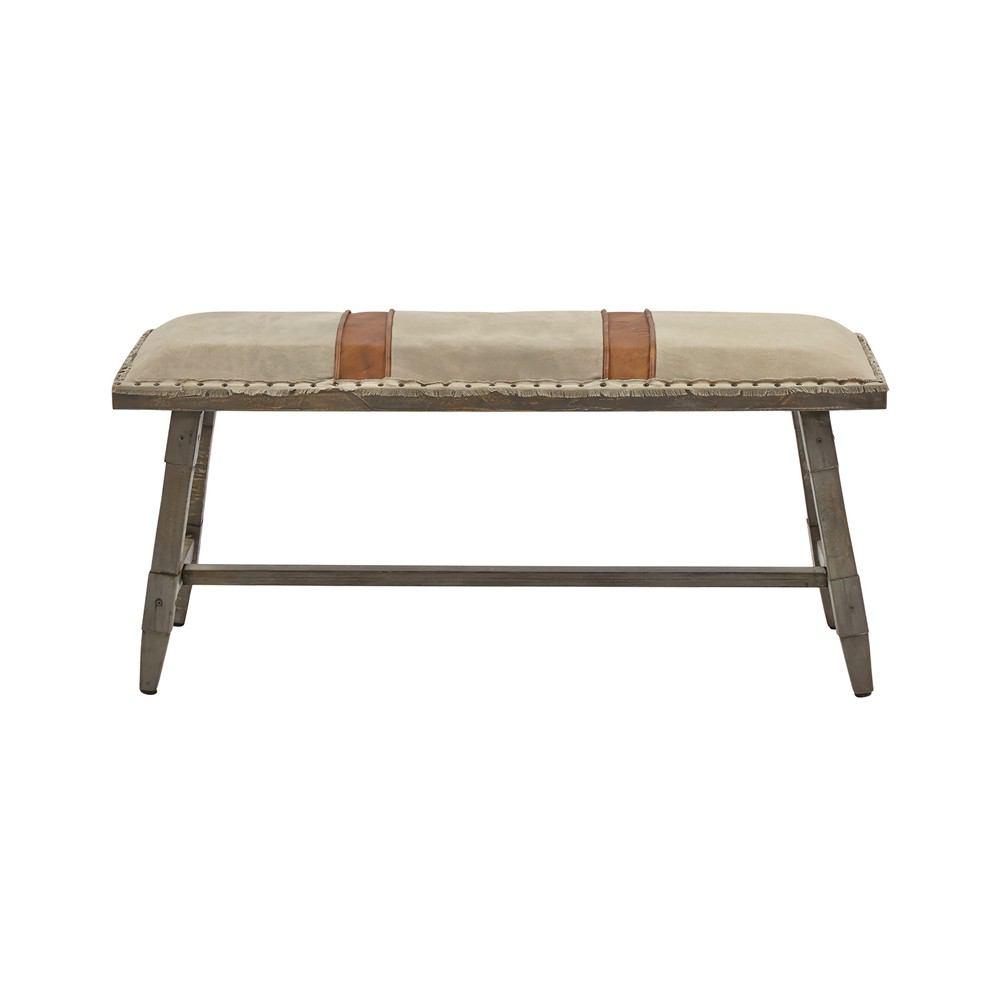 Upholstered accent bench in light gray suede cloth cross banded in brown leather like fabric. Nailhead trim around bench top. Gray washed legs and stretcher base .