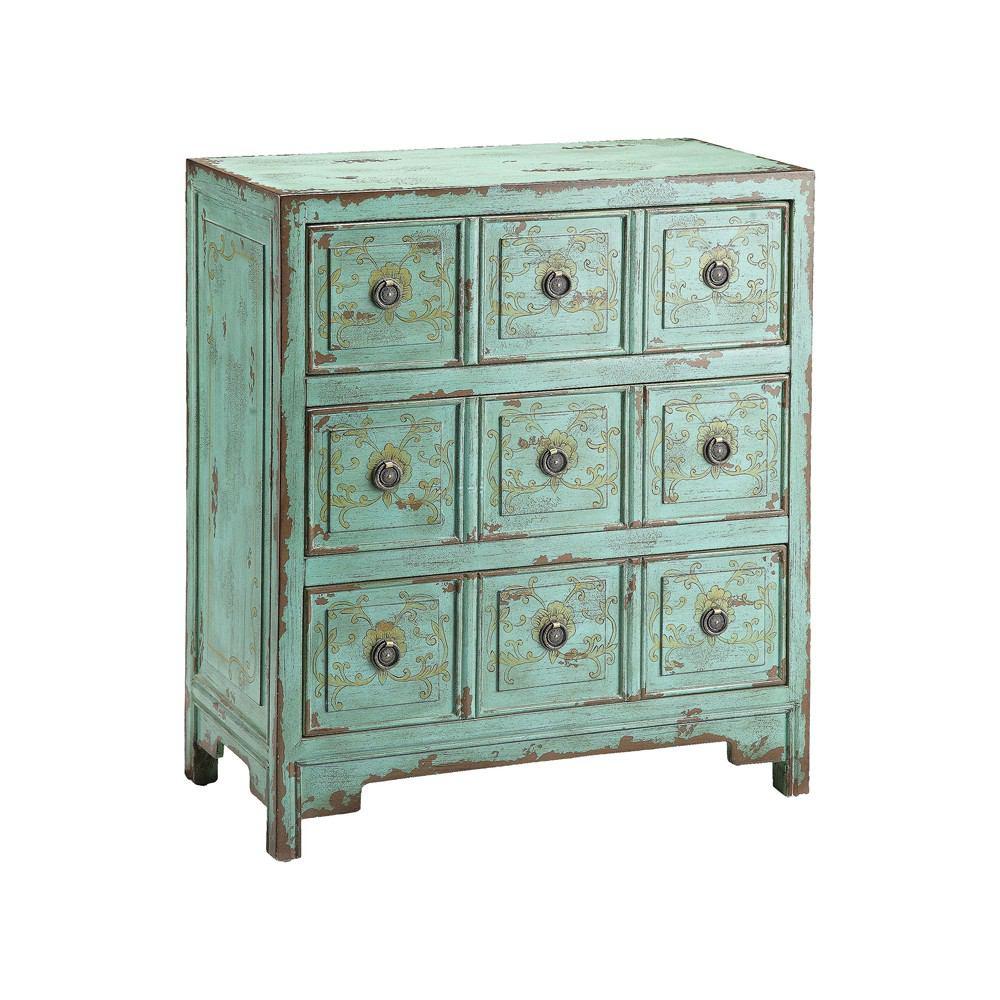 Lovely hand painted vintage green apothecary style chest features a faded goldenrod floral motif and three drawers.