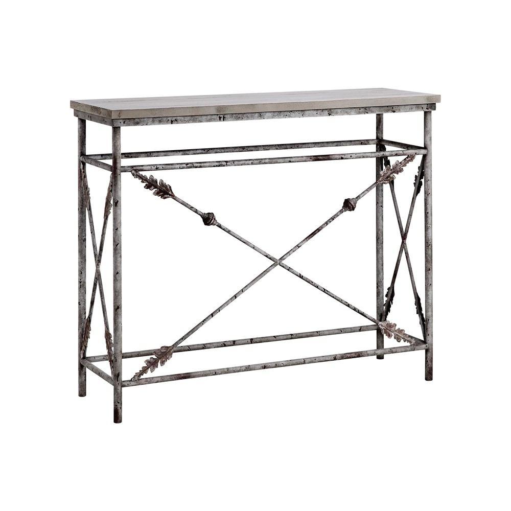 Console table. Natural gray washed wood-tone top. Aged metal base with open leaf "X" design on front and sides.