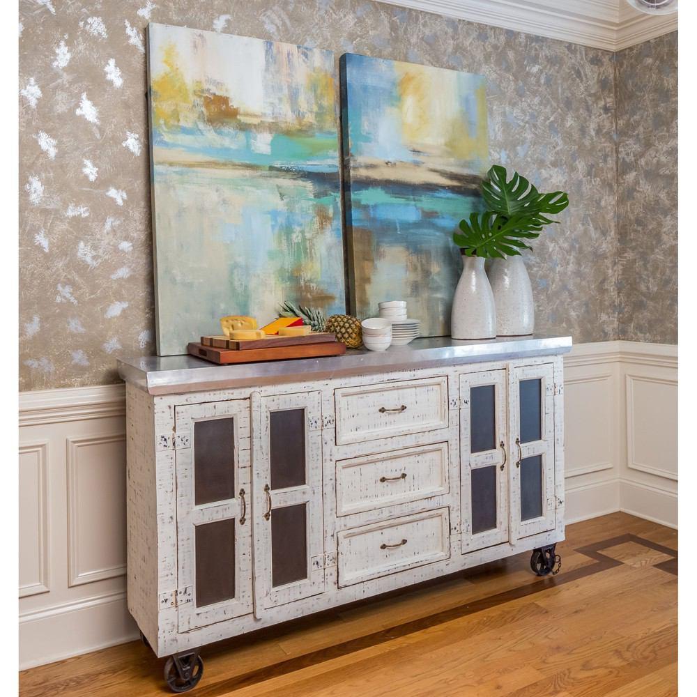 For use as an extra kitchen, dining or entertainment piece, our 3 drawer, 4 glass door, moveable sideboard offers a natural reclaimed wood look and galvanized metal top.
