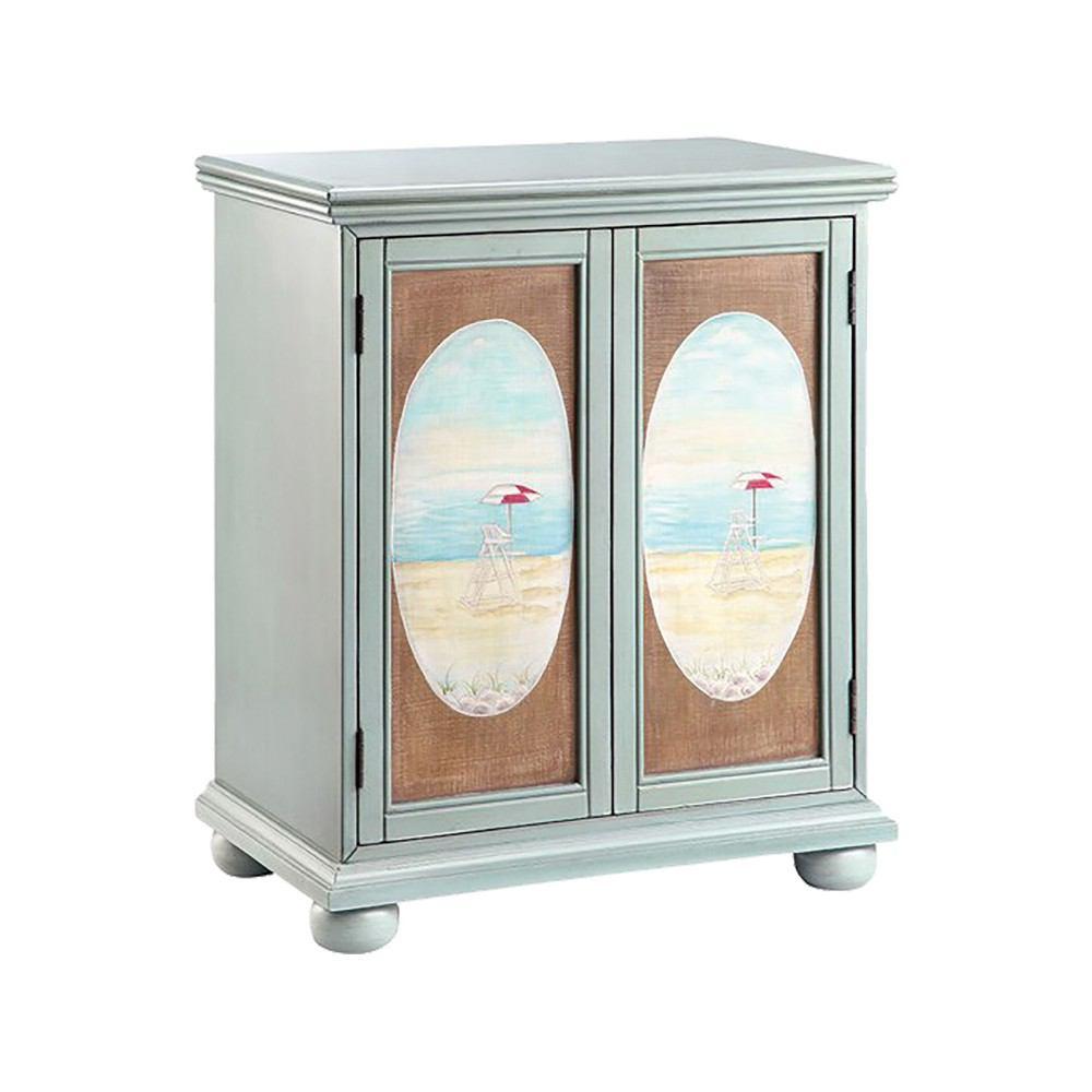 Two-door cabinet with one fixed shelf and bun feet. Touch-latch doors. Hand-painted smoky aqua and brown linen finished oval panels on door fronts. Lifeguard chair scene on doors.