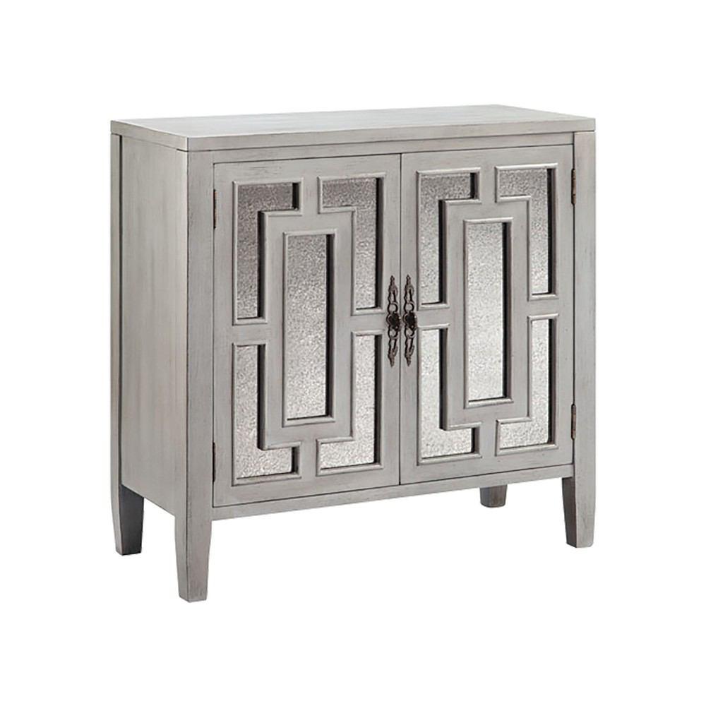 Two-door cabinet with adjustable shelves and wire management on back panel. Antique mirrored glass set behind smoky grey architectural fretwork . Tapered legs.