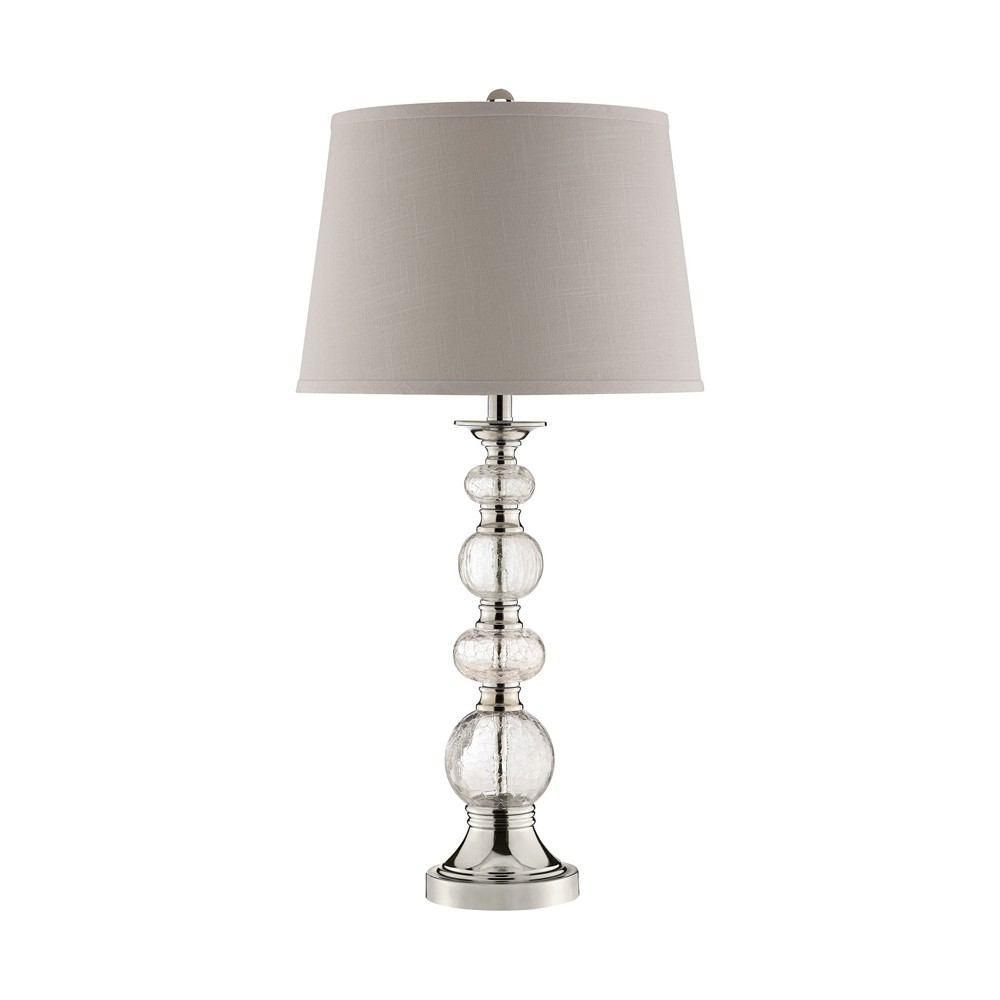 Chrome finish metal with stacked clear crackle glass spheres table lamp. Ivory fabric round hardback shade.