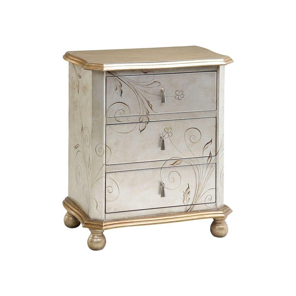 Rich hand painted silver and gold metallic three drawer accent chest, chamfered edges, polished silver pulls and round bun feet.