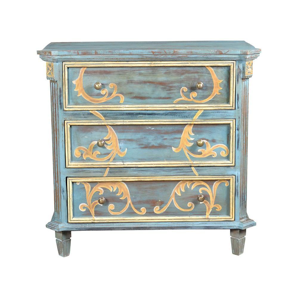 Three-drawer cabinet. Painted weathered cornflower blue finish with gold tone scroll design on drawer fronts. Antique brass finish drawer knobs.