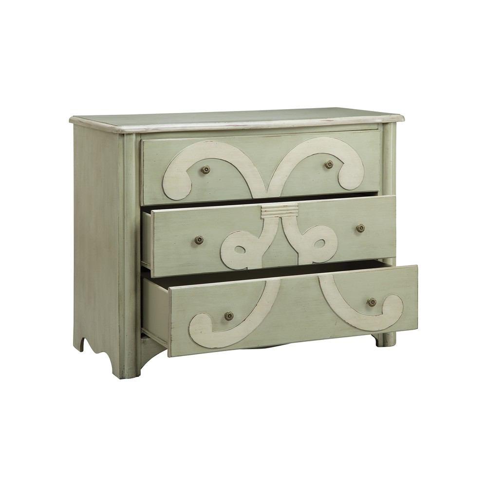 Chest, three drawers, raised decorative "X" scroll, hand painted aged soft cadet grey and cream finish with a light gloss sheen.