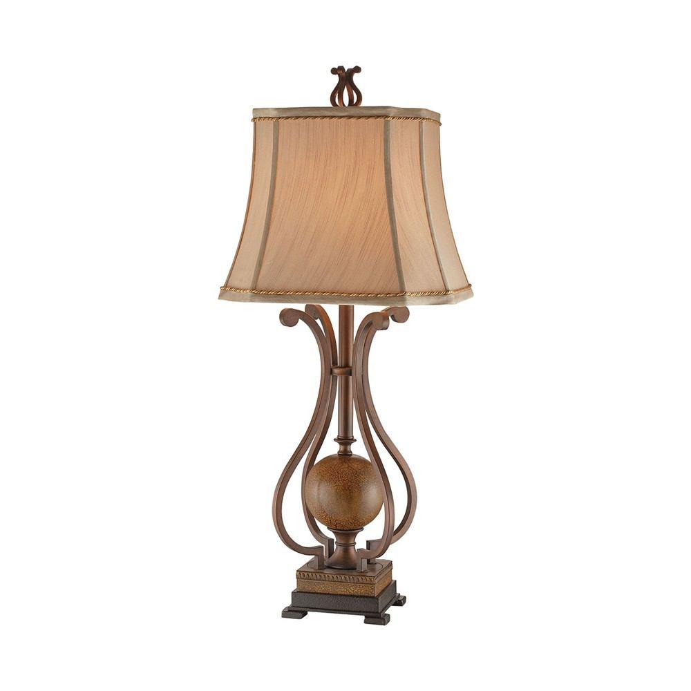 Iron scroll table lamp with crackle resin font and platform base. Cut corner neutral shade with trimmed edge detailing.