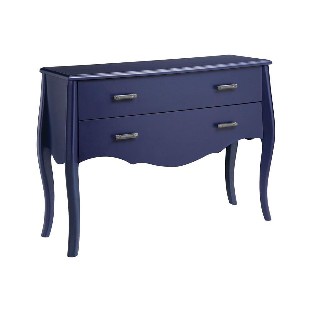 Two-drawer oversized high-leg chest. Hand-painted indigo finish . Carved apron with cabriole legs. Pewter finish flat bar hardware.