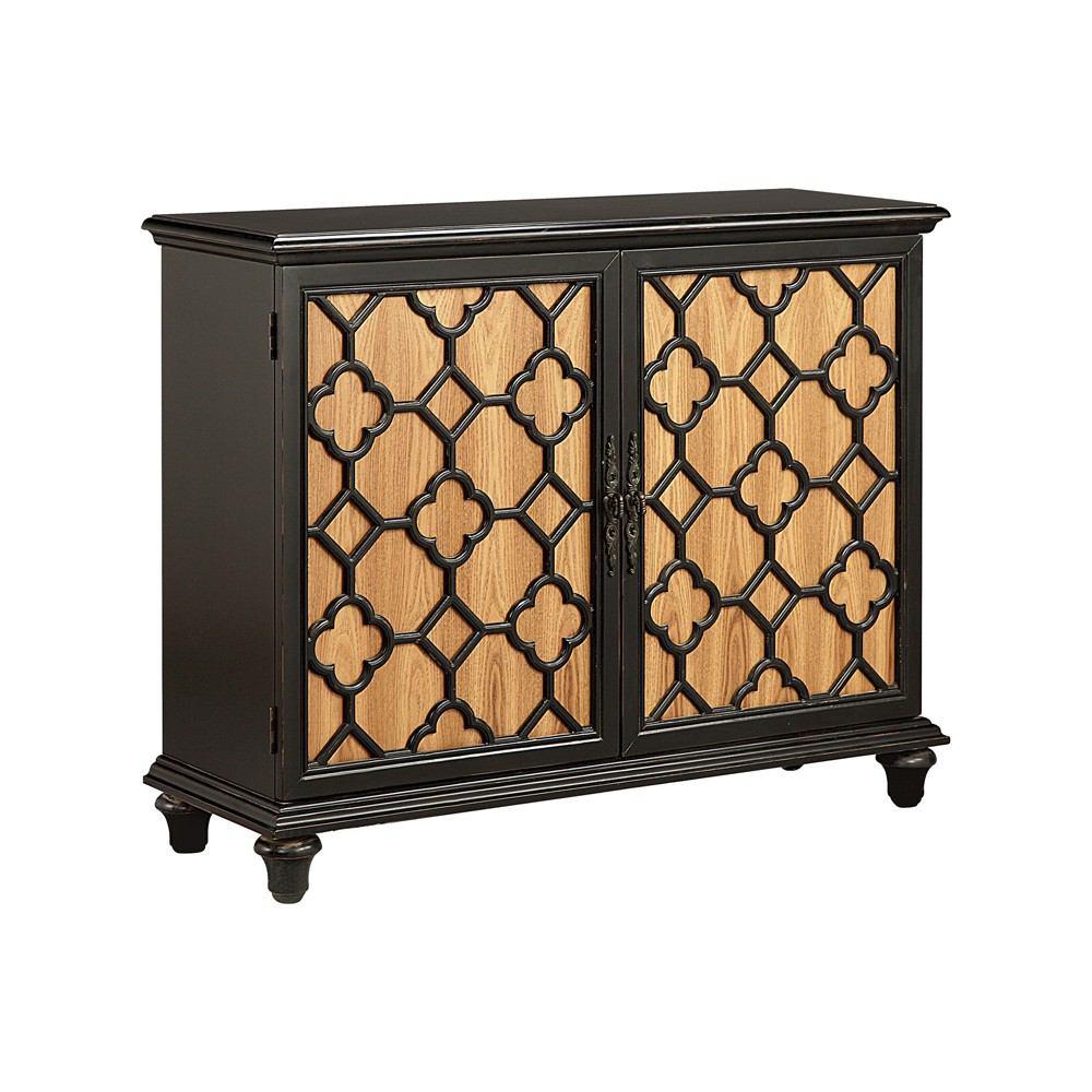 Two-door cabinet with two adjustable shelves and wire management on back panel. Hand-painted black finish with light oak wood-tone front door panels. Quatrefoil and diamond fretwork design on door panels.