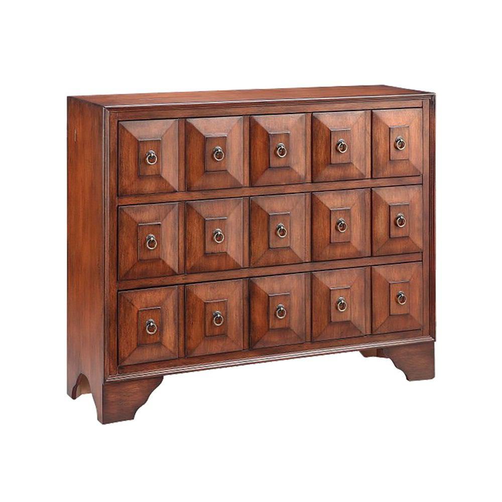 Three-drawer apothecary style chest. Hand-painted warm wood tones. Drop-ring pull hardware.