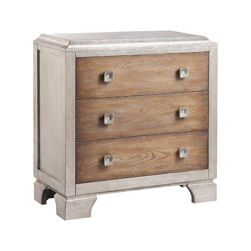 Three-drawer accent chest. Aged silver hand-painted finish with wood grain painted drawer fronts. Etched square oversized metal hardware .