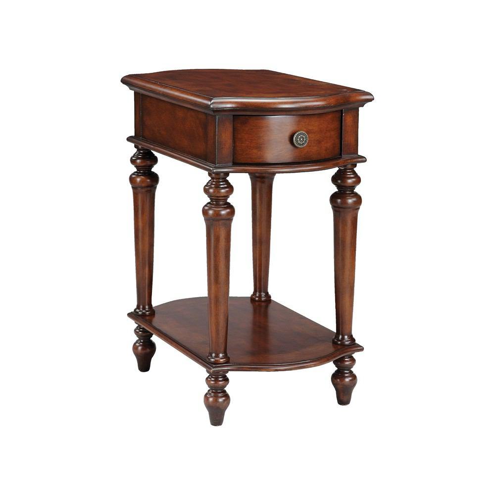 One-drawer chairside table with lower storage shelf. Hand-painted mahogany finish. Turned style legs.