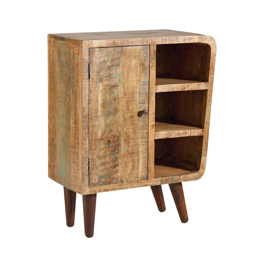 One-door cabinet with side shelves. Mid-century modern design in reclaimed acacia wood . Weathered hand-painted finish. Rustic knob hardware with retro tapered legs.