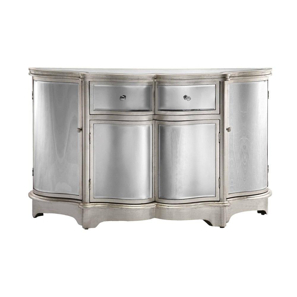 Dazzling credenza or sideboard featuring curved bent mirror door and drawer facings, silver leaf finish, two drawers, touch latch center doors with an adjustable interior shelf and the two side doors open to two interior fixed shelves.
