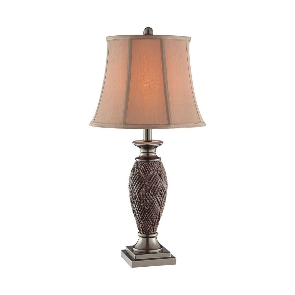 Aged brown basket weave pattern resin table lamp. Square stacked pewter finished metal base. Taupe sateen fabric bell softback shade.