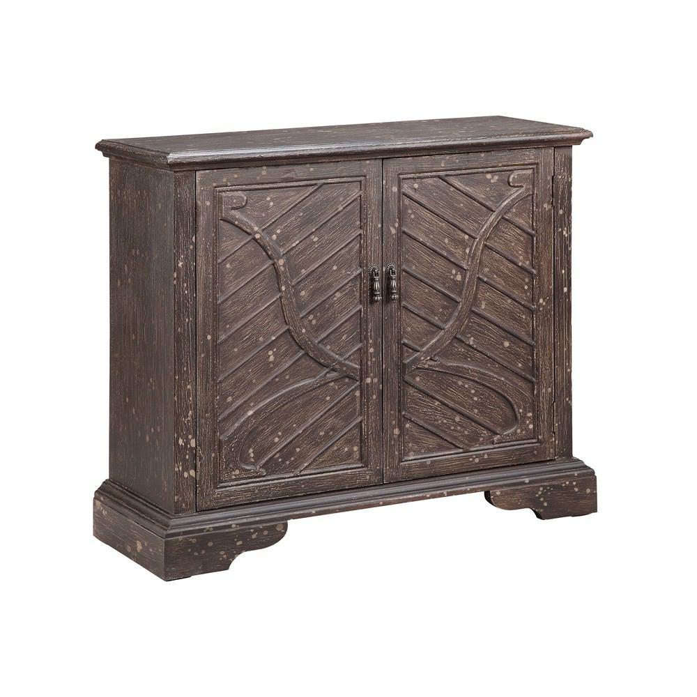 Two-door accent cabinet with one fixed shelf and wire management on back panel . Raised art deco design on front door panels . Hand-painted chimney smoke black washed finish with white rub through. Curved bracket