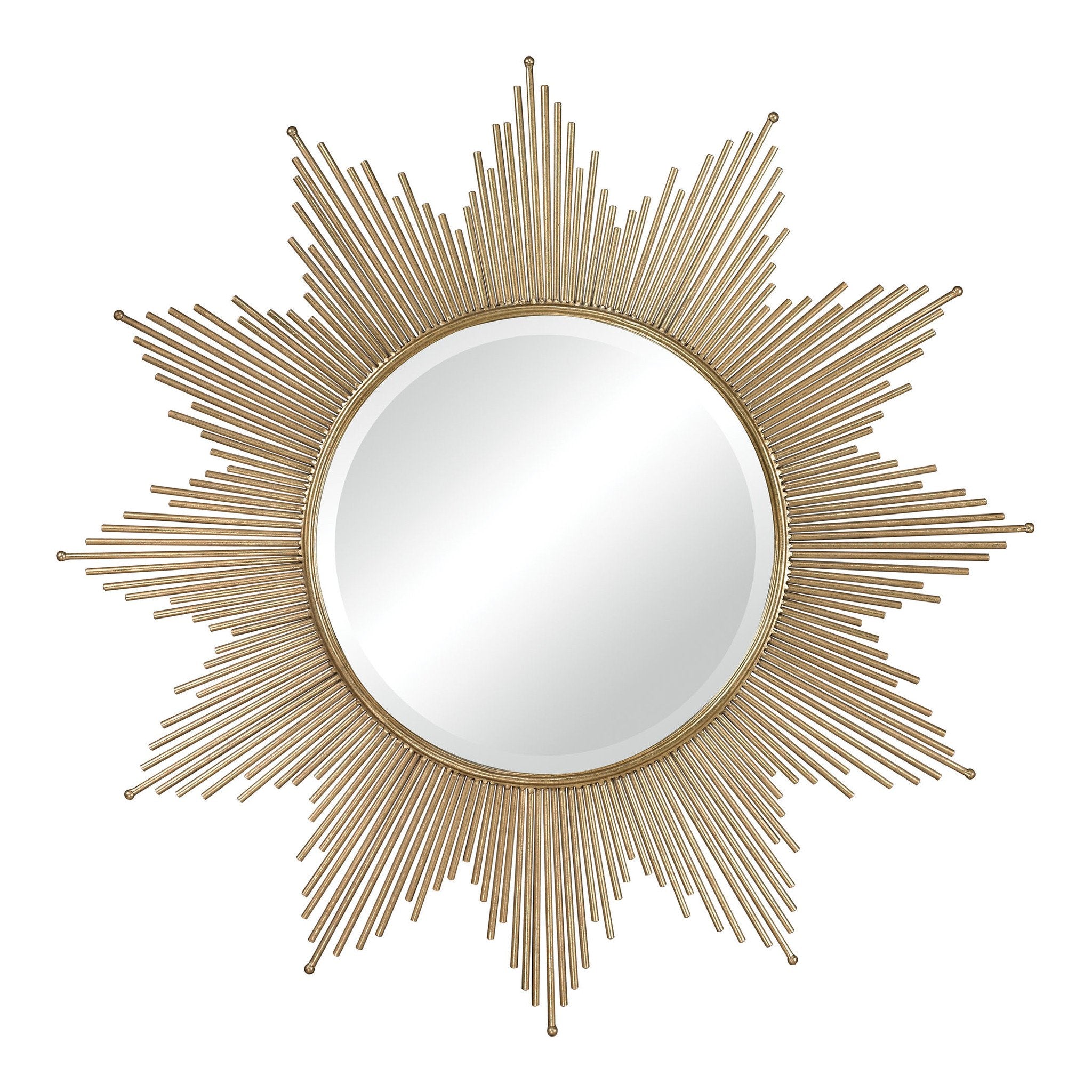 This stunning Churchfield Starburst Wall Mirror from Sterling is so stylish with its rays creating an instant focal point over a mantel, sofa, console table, or on any wall adding warmth and depth to the space. The Starburst frame is metal that has been gold leafed and surrounds a beveled mirror. The overall size measures 41 inches in diameter.