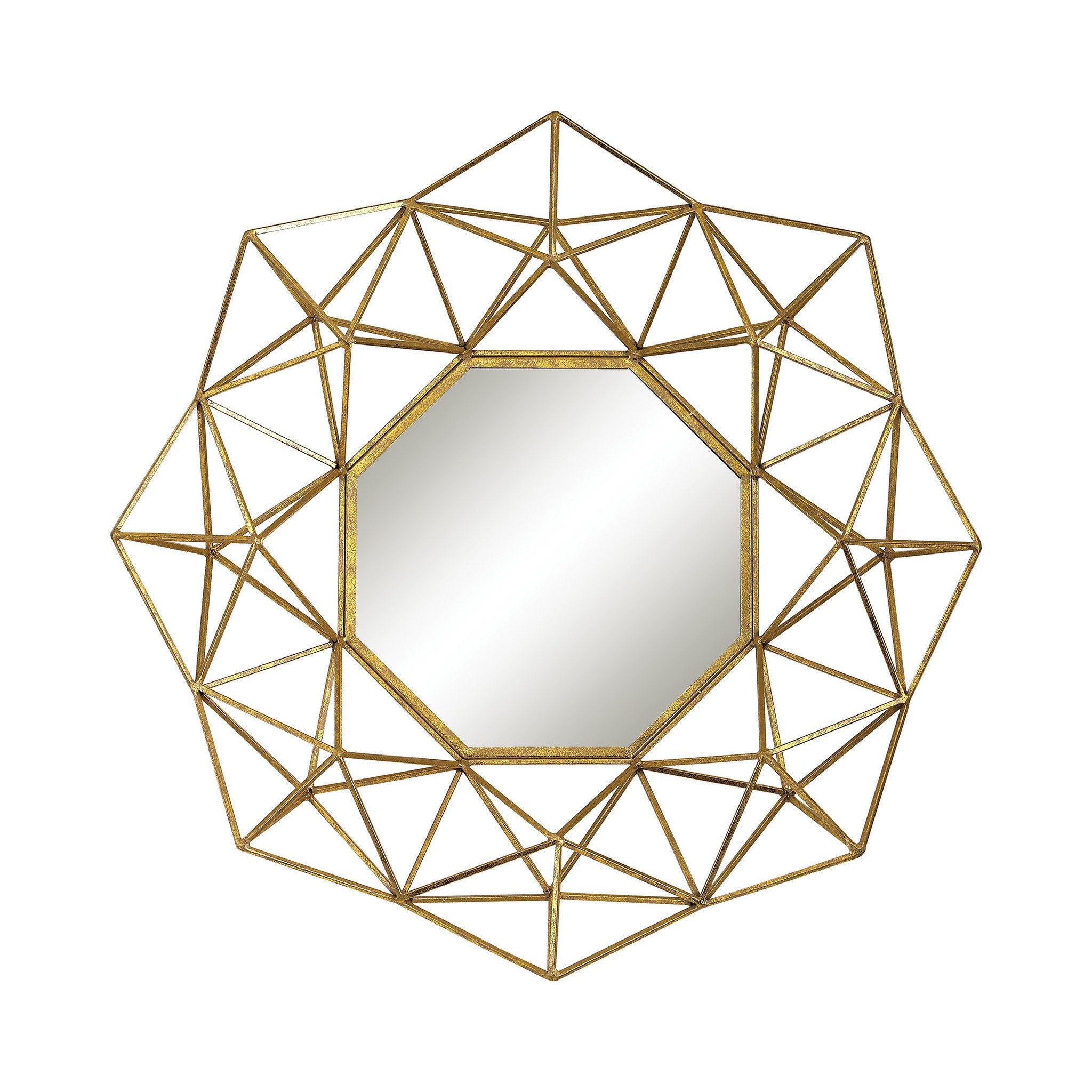 Part of the task of a mirror is the preservation of light. Part of the task of geometry is the explanation of space. Space and Light are therefore brought together with our ChapelleCollection Geometric Wire Mirror. A wreath of three-dimensional trapezohedrons surround a quality octogonal mirror like geometric tracery surrounding an ornate window. Openwork welding lends visual interest and allows for the color of the wall behind to be visible. Perfect in the Powder Room. Distressed Gold finish.
