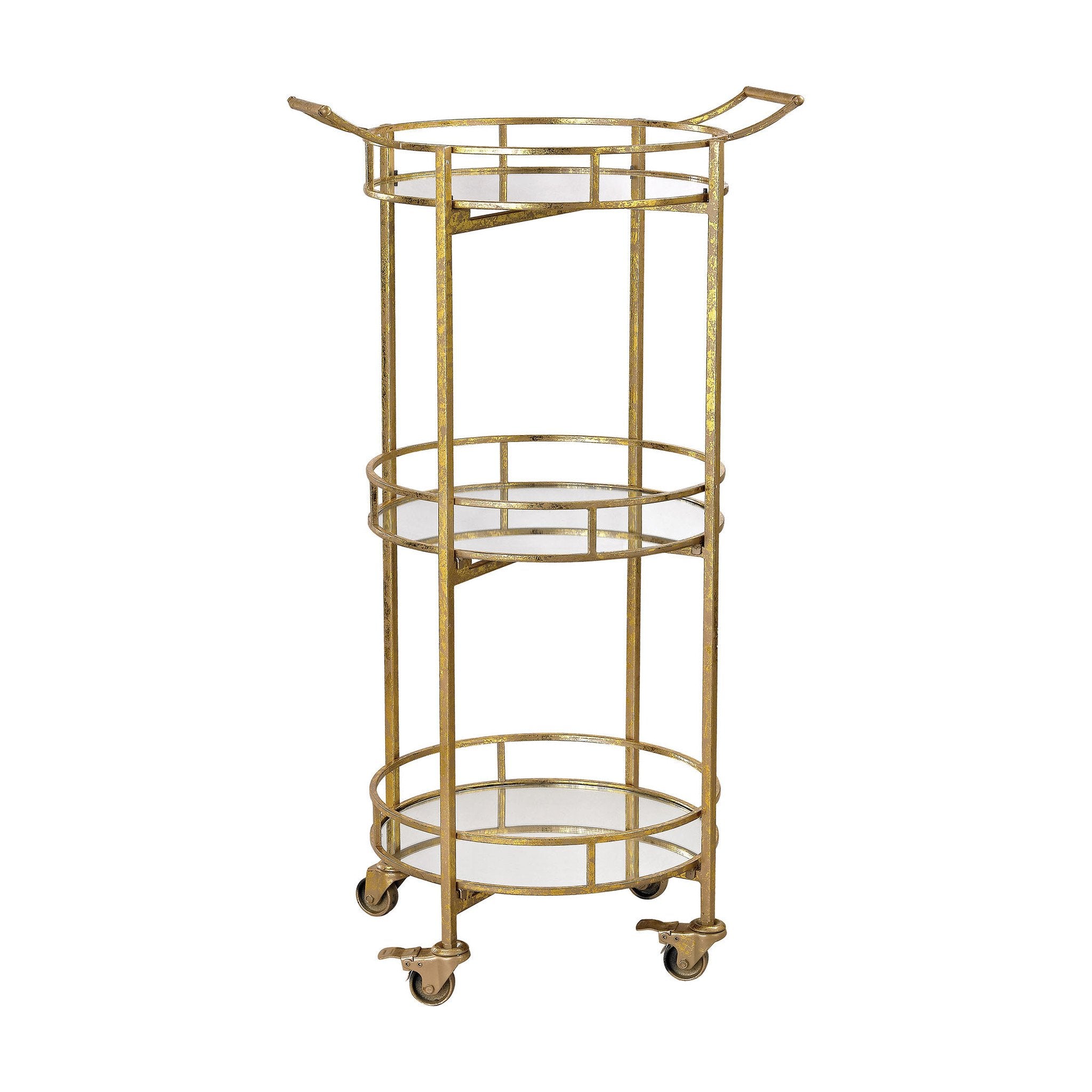 Your guests will be shaken and stirred when they get a look at our streamlined Julep Series Mirrored Bar Cart. Slender Golden metalwork exudes the "snap" and glamour of Mid-Century furnishings, while three circular tiers of elegantly-banded mirrored shelving contain spills and provide functional storage. Snazzy casters allow the host to maneuver through cliques of friends, while a working wheel brake adds stability. Whether in the parlor or around the pool, the Julep makes it a breeze to keep the party moving.