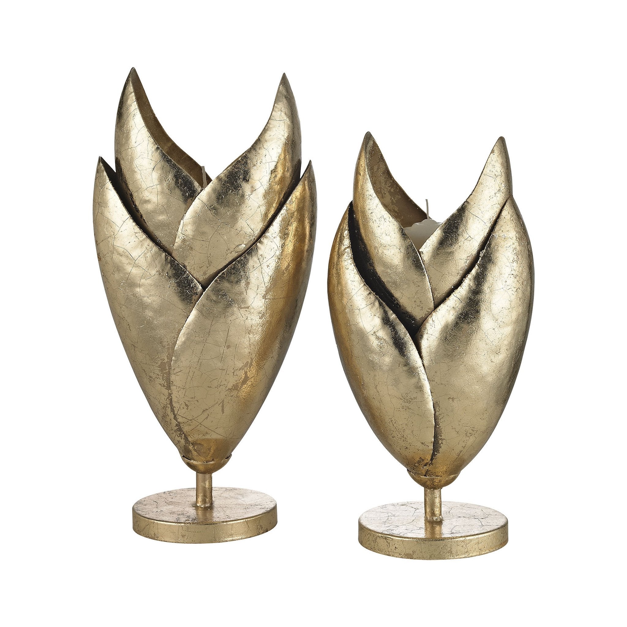 Who among us wouldn't want to nestle themselves among the slowly opening bracts of a newly budding, lustrously Golden flower? Born in a magical place where protective hurricanes and charming decorative accessories converge, our Honeychaff Candle Holders, with their stylishly distressed Gold Leaf texture story and uniquely handcrafted overlapping blossoms, are ready to emit a soft burnished glow into any design space.
