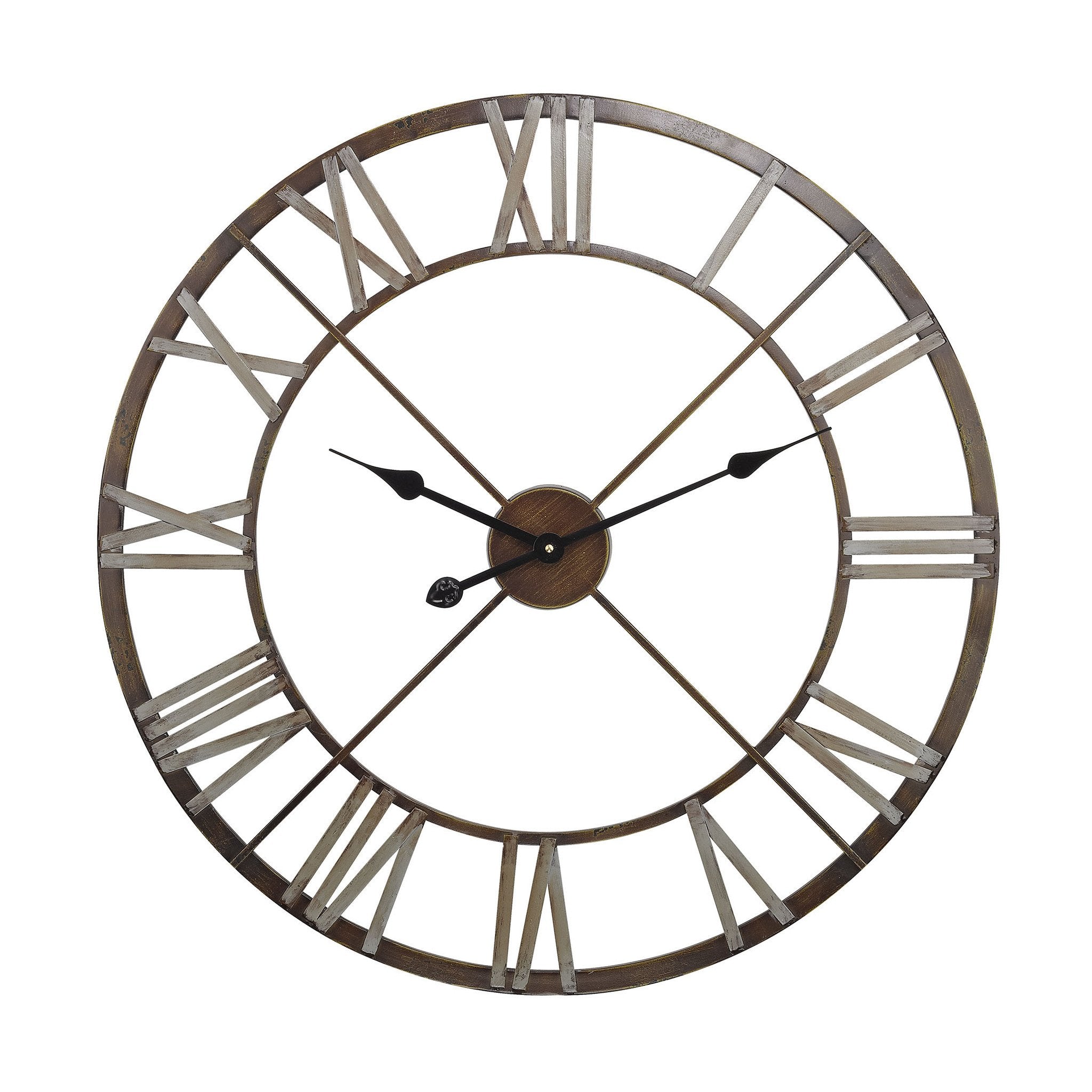 This wall clock features an open center with Roman numerals in relief around the edge allowing the background color of the wall behind to show through.