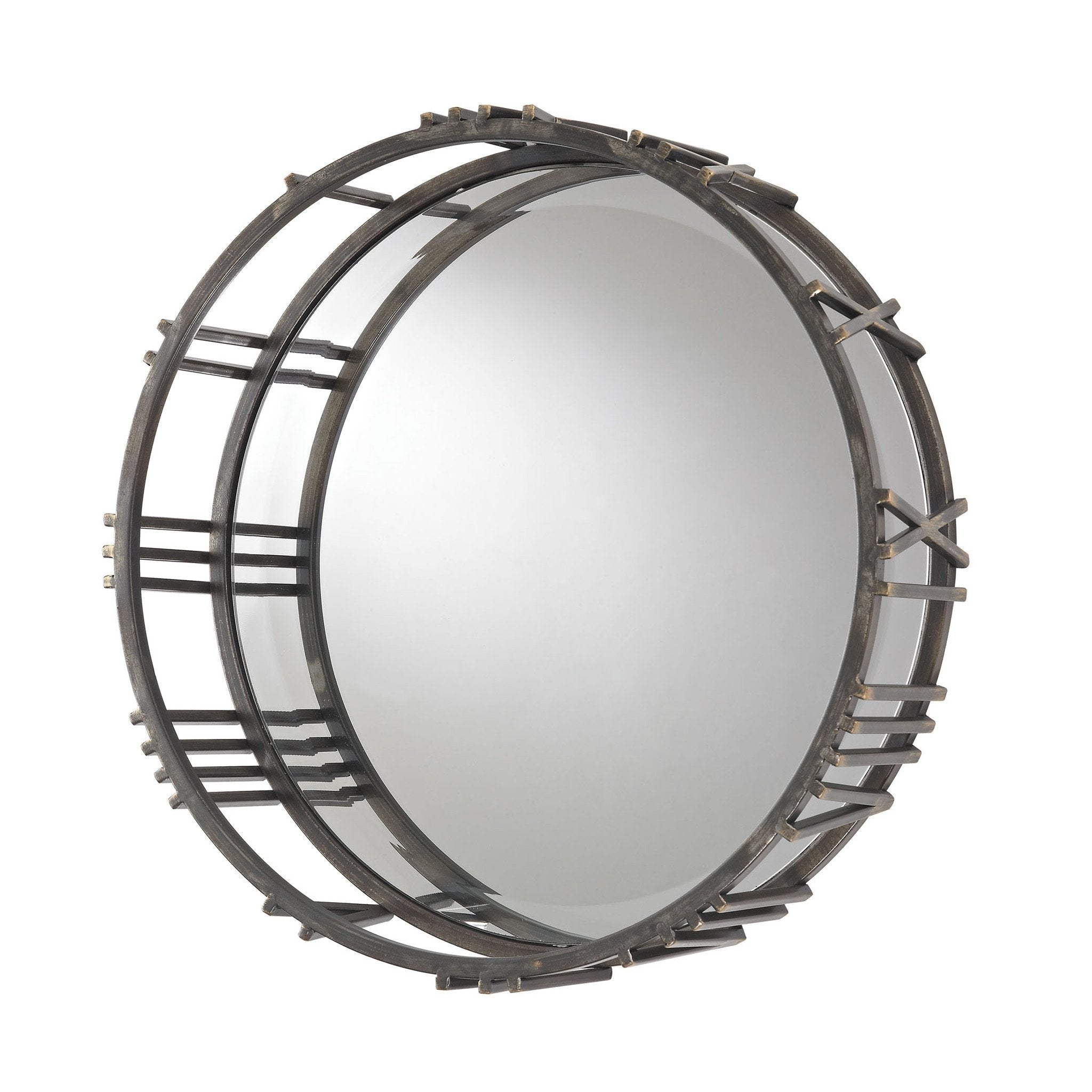 This circular mirror sits inside a METAL FRAMEwork frame with Roman numerals around its outer edge. Can be used as a wall mirror or display tray