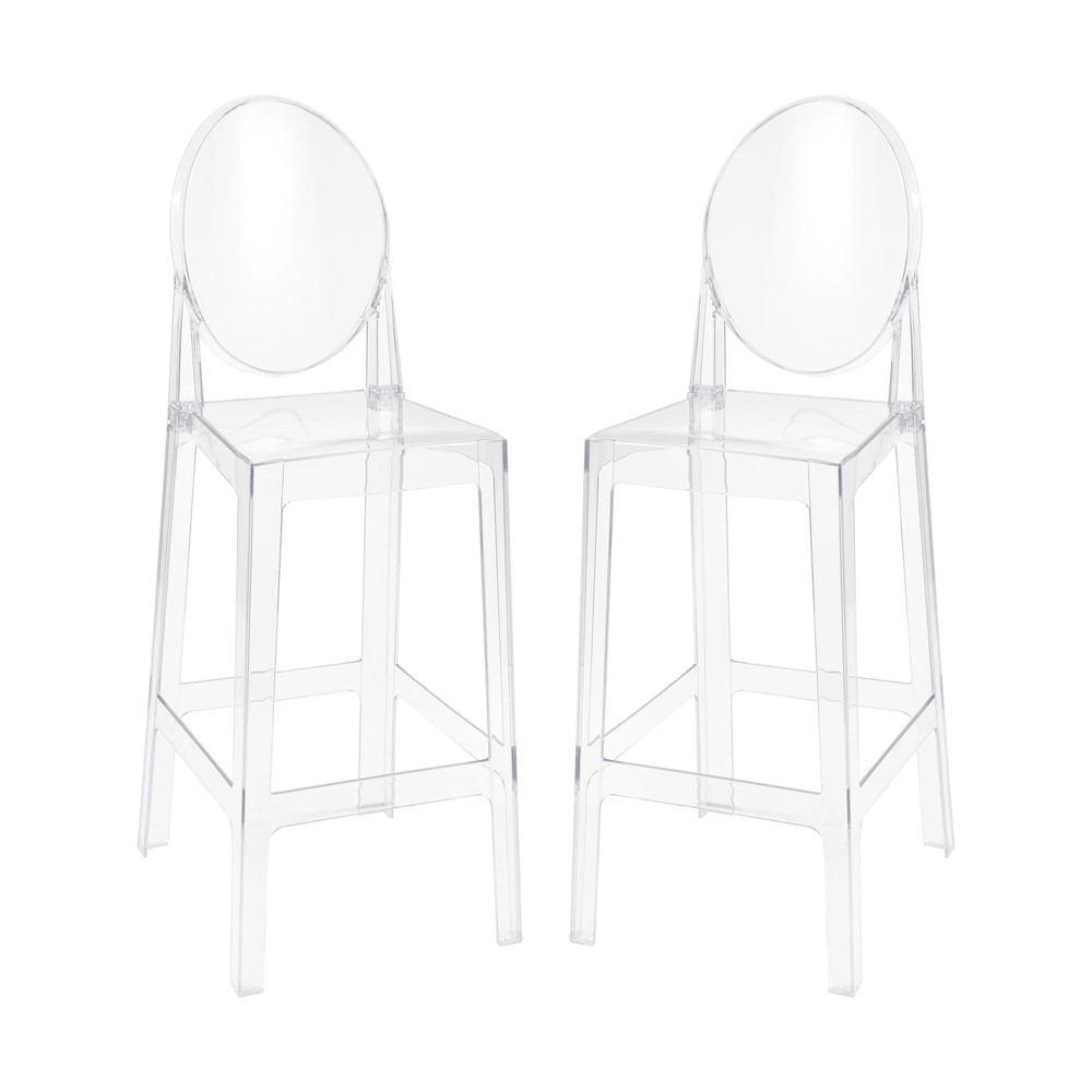 Elegance is maximum style with minimum effort. Our Vanish Bar Stools bring modern transparency and visual lightness to signature European styling. Sensuous oval back done in Rococo-Revival style, with clean-line modern base. Durable, but portable, with excellent design range. Convenient foot rests. Set of 2.