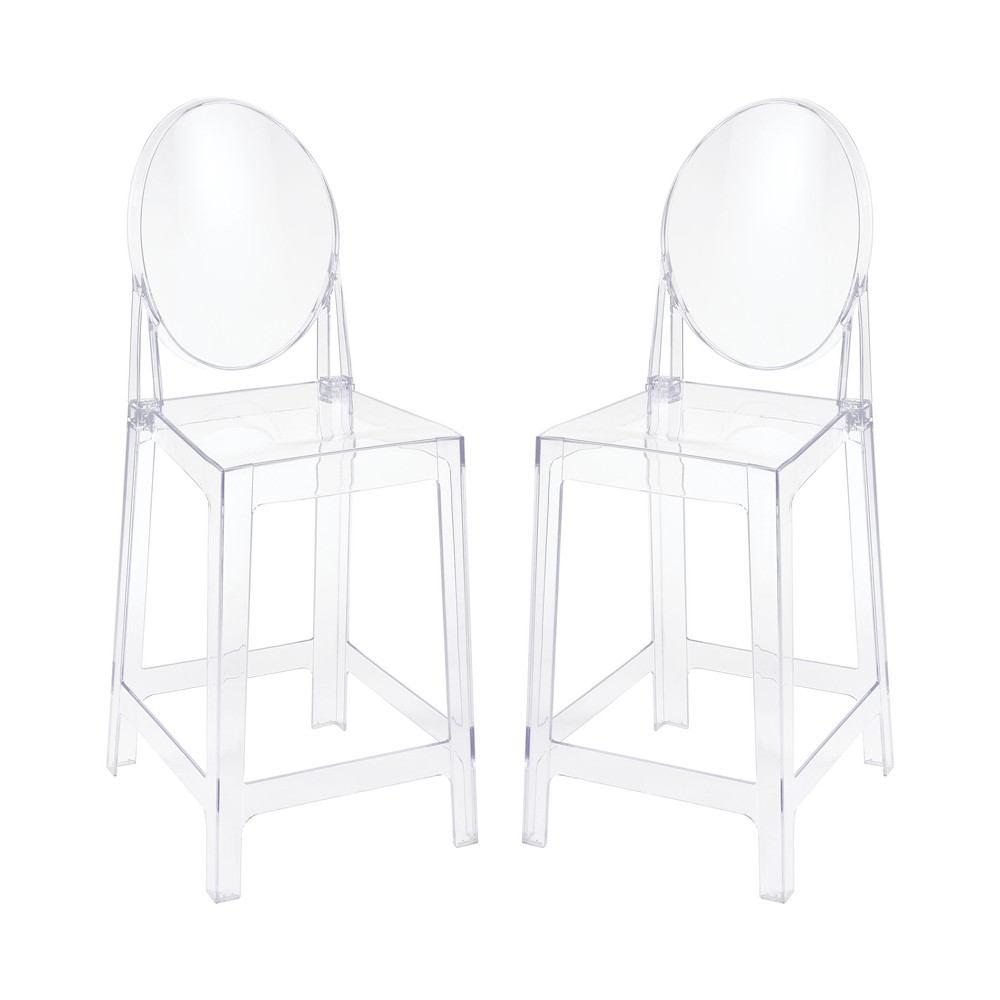 Elegance is maximum style with minimum effort. Our Vanish Counter Stools bring modern transparency and visual lightness to signature European styling. Sensuous oval back done in Rococo-Revival style, with clean-line modern base. Durable, but portable, with excellent design range. Convenient foot rests. Set of 2.